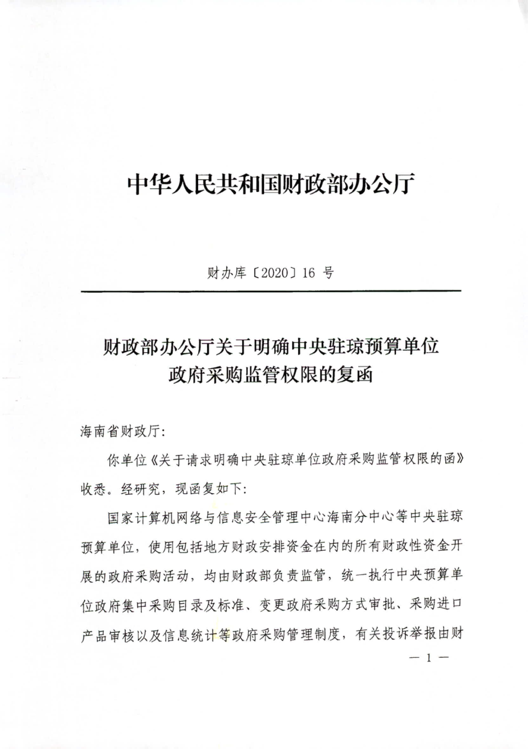 《关于明确中央驻琼预算单位政府采购监管权限的复函》指出,国家计算机网络与信息安全管理中心海南分中心等中央驻琼预算单位,使用包括地方财政安排资金在内的所有财政性资金开展的政府采购活动,均由财政部负责监管,统一执行中央预算单位政府集中采购目录及标准、变更政府采购方式审批、采购进口产品审核以及信息统计等政府采购管理制度,有关投诉举报由财政部负责处理。