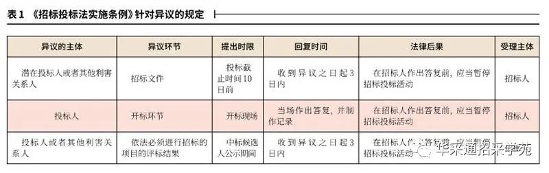 《招标投标法》和《招标投标法实施条例》对招标投标异议的提出和解决作出了明确的规定。《招标投标法》第六十五条规定“投标人和其他利害关系人认为招标投标活动不符合本法有关规定的,有权向招标人提出异议或者依法向有关行政监督部门投诉。”《招标投标法实施条例》还对提出异议的主体、异议事项、提出异议的时间等内容作出了更加明确的规定,具体内容详见表1。