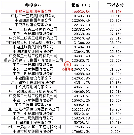 通过上面的开标记录以及基建通发布的中标公示,中建三局在惨烈的竞争中杀出一条血路,以下浮43.16%的“壮举”,成为了第一中标候选人。