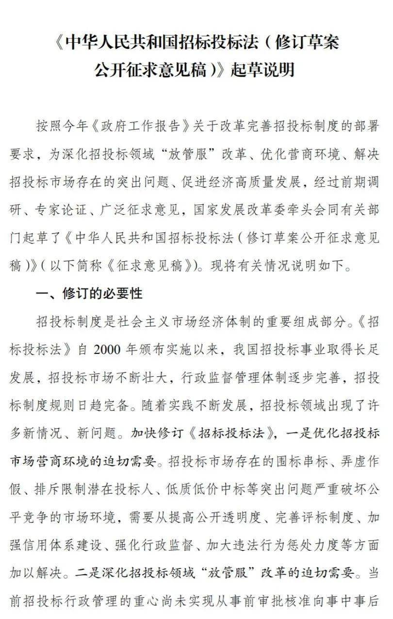 国家发展改革委发布了《中华人民共和国招标投标法(修订草案公开征求意见稿)》向社会公开征求意见。此举标志着, 自1999年颁布已经施行20余年的《招标投标法》将迎来大修!