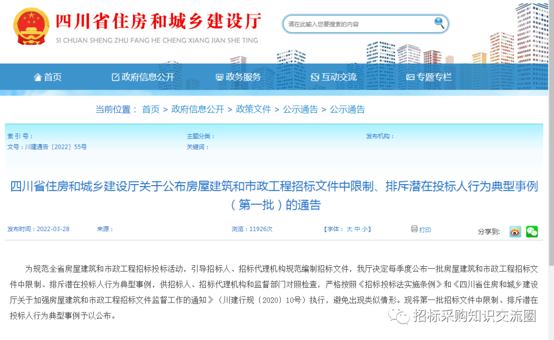 近日,四川省住建厅发布《关于公布房屋建筑和市政工程招标文件中限制、排斥潜在投标人行为典型事例(第一批)的通告》。据悉,四川省住房和城乡建设厅决定每季度公布一批房屋建筑和市政工程招标文件中限制、排斥潜在投标人行为典型事例,供招标人、招标代理机构和监督部门对照检查,严格按照《招标投标法实施条例》和《四川省住房和城乡建设厅关于加强房屋建筑和市政工程招标文件监督工作的通知》(川建行规〔2020〕10号)执行,避免出现类似情形。