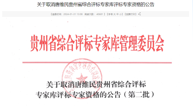 根据《中华人民共和国招标投标法实施条例》第七十二条以及《贵州省综合评标专家库评标专家考评办法》第五条等有关规定,决定取消唐维民贵州省综合评标专家库评标专家资格,不得再参加依法必须进行招标项目的评标评审,并从贵州省综合评标专家库中除名。