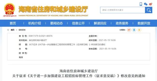 5月19日,海南省住建厅发布《关于征求<关于进一步加强建设工程招投标管理工作(征求意见稿)>修改意见的通知》。