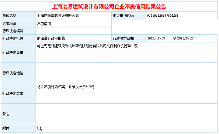 上海浚源建筑设计有限公司与上海经纬建筑规划设计研究院股份有限公司文件制作机器码一致,皆被记入不良行为档案,并予以公示3个月。