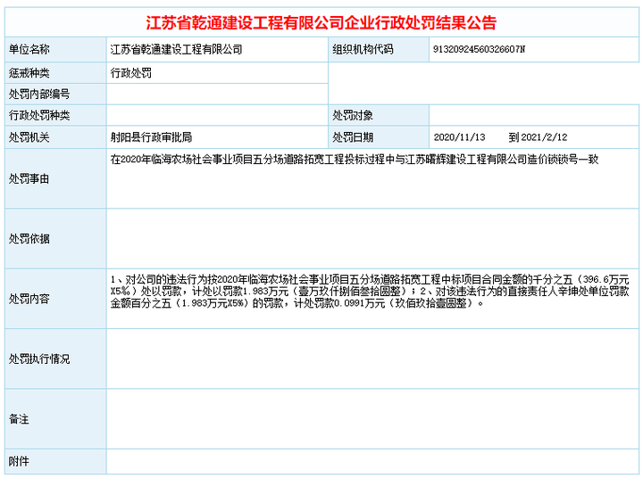 通过江苏建设工程招标网发布的处罚公告和对相关法律的了解,建工社微课程清楚的知道,相关部门是依据《招投标法》第五十三条对江苏省乾通建设工程有限公司、江苏曙辉建设工程有限公司进行的行政处罚,即企业按照2020年临海农场社会事业项目五分场道路拓宽工程中标项目合同金额的千分之五(396.6万元X5‰),负责人按单位罚款金额百分之五计算。由于2020年临海农场社会事业项目五分场道路拓宽工程中标项目合同金额不大:396.6万元,处罚金额就显得少一些。