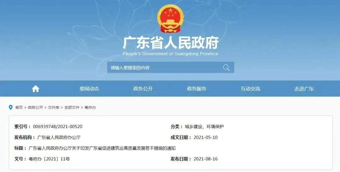 8月16日,广东省人民政府网站发布了《关于印发广东省促进建筑业高质量发展若干措施的通知》。