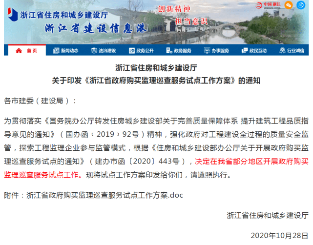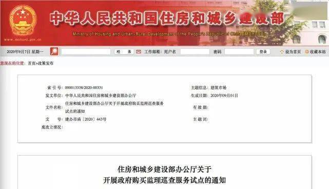 2020年9月1日,住建部下发了《关于开展政府购买监理巡查服务试点的通知》, 指出用两年的时间,在江苏、浙江、广东三省的部分地域试点政府购买监理巡查服务,旨在探索工程监理服务转型方式,提升建设工程质量水平,提高工程监理行业服务能力,从而促进监理行业持续健康发展。