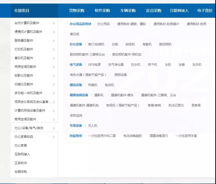 “办公/设备/电气/其他类”门类产品都包含什么呢?涉及产品范围如下